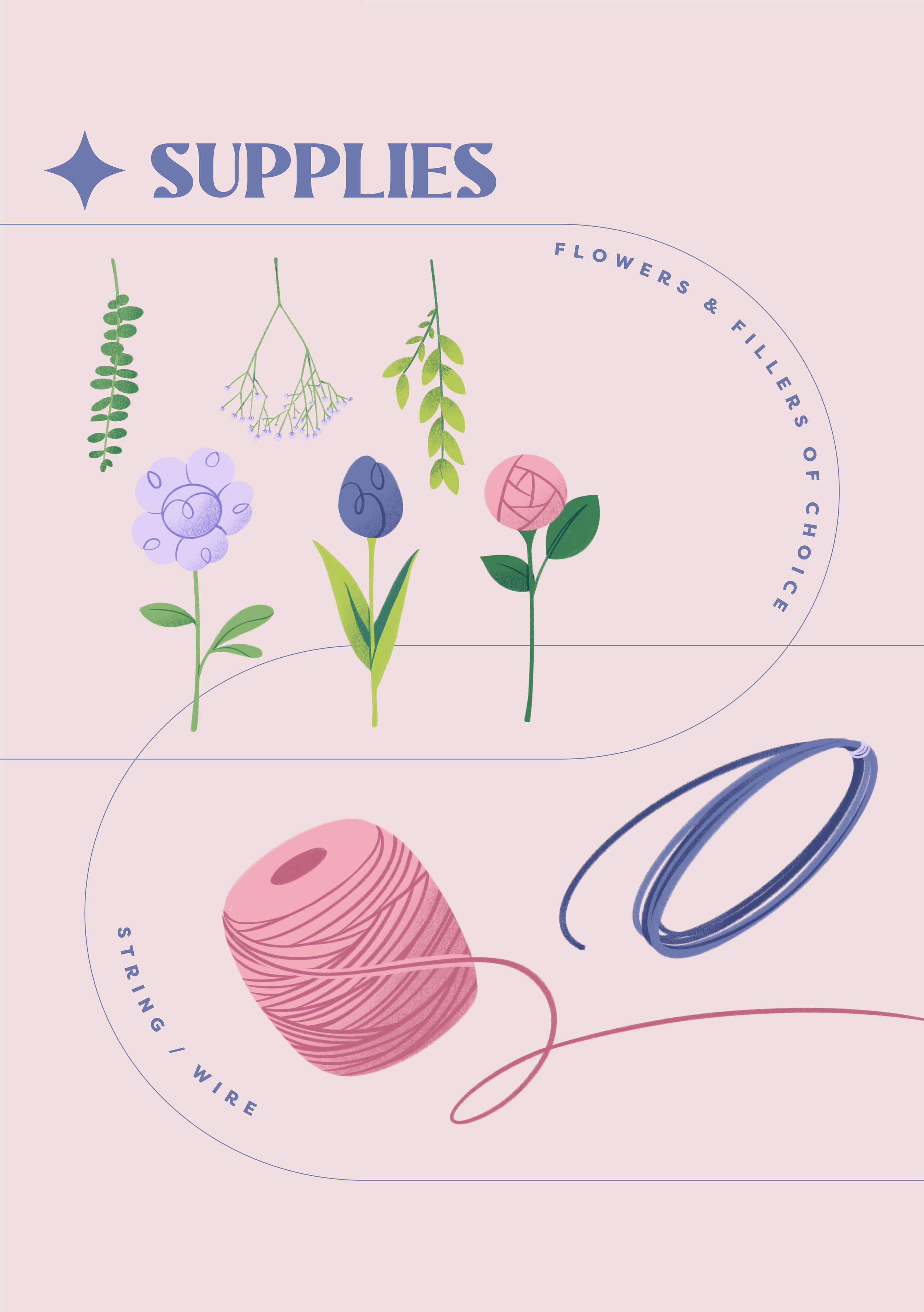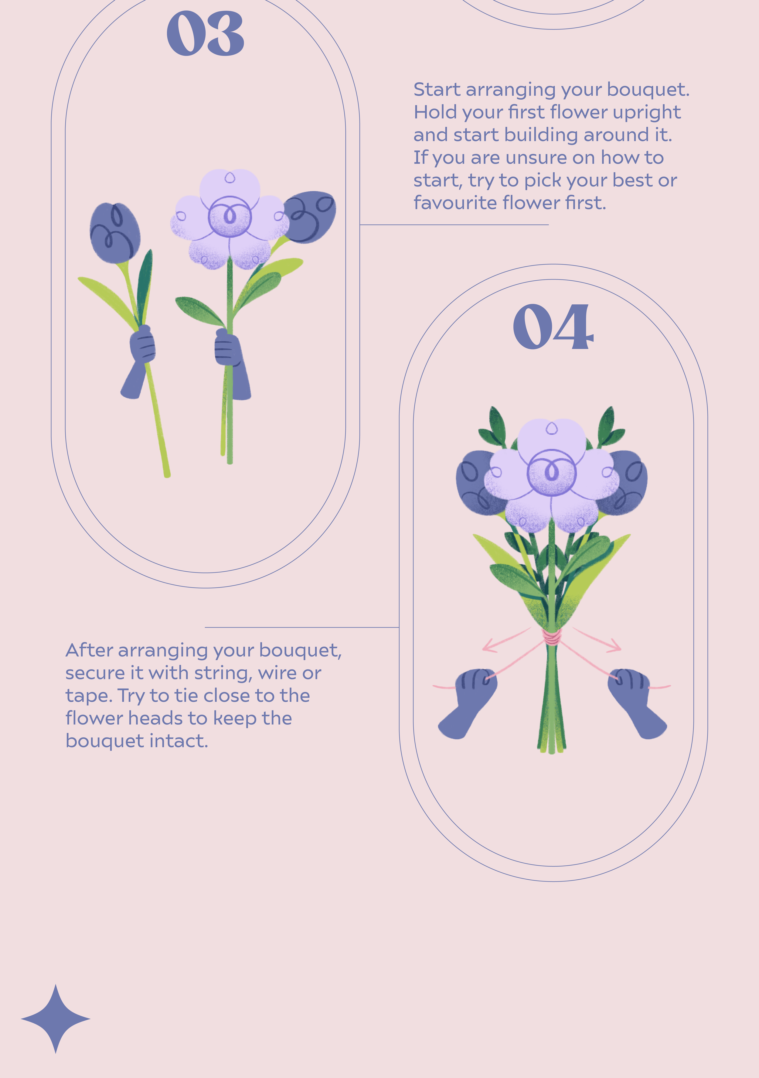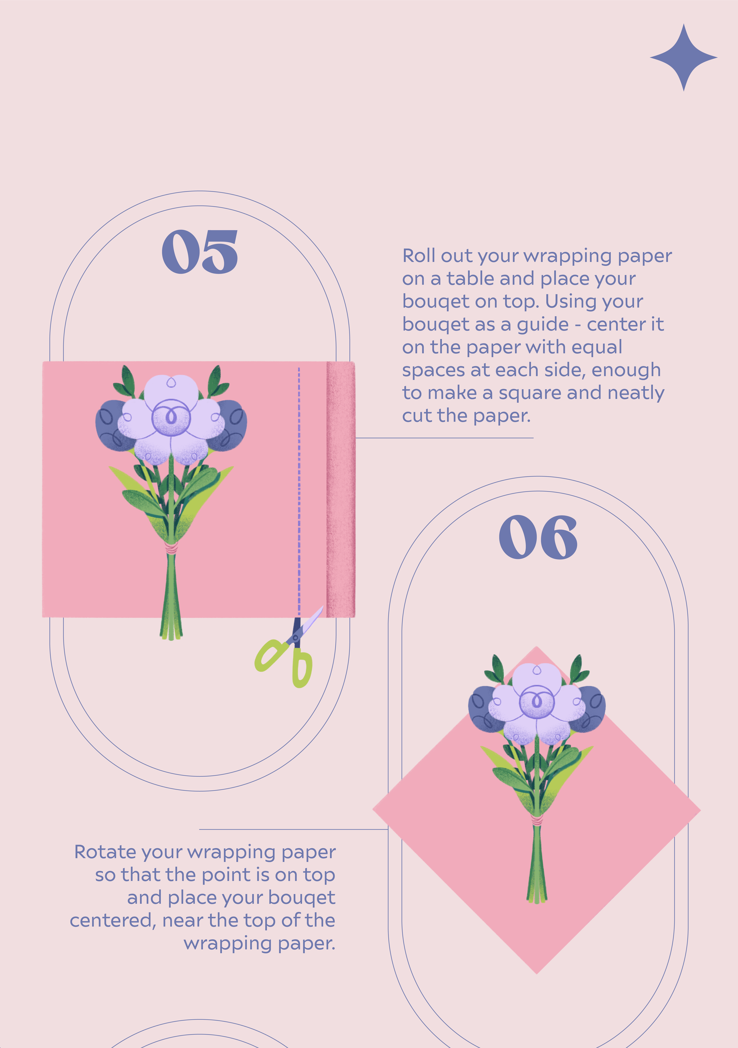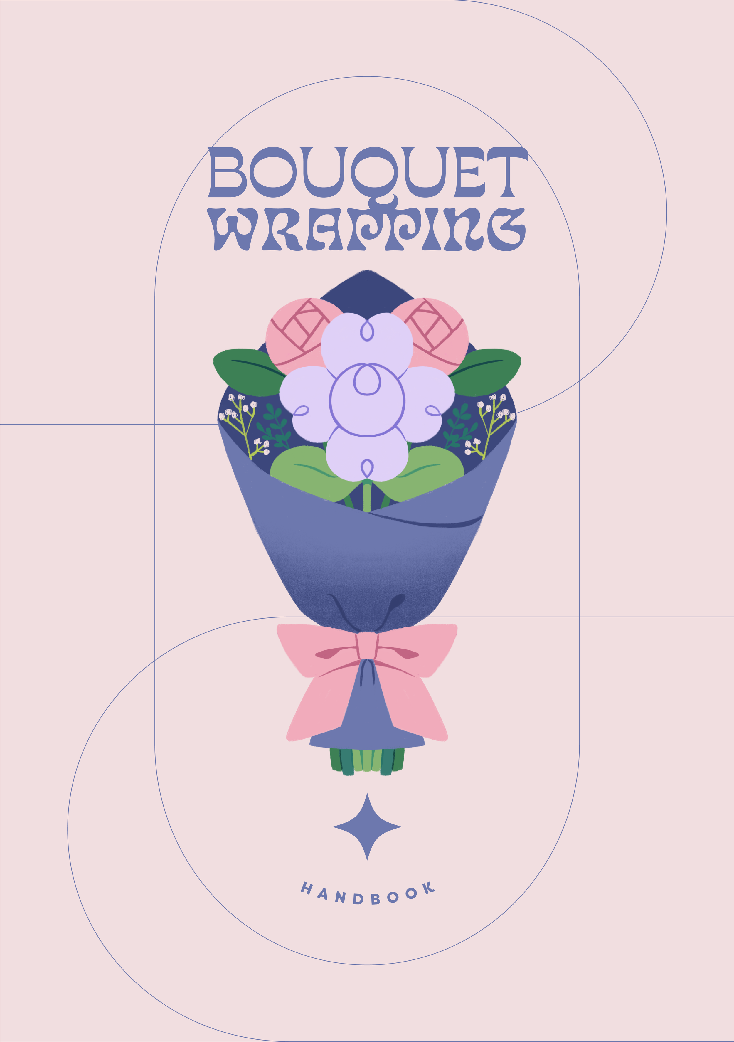 A booklet design with illustrations for teaching how to wrap your own bouquet with step by step instructions.