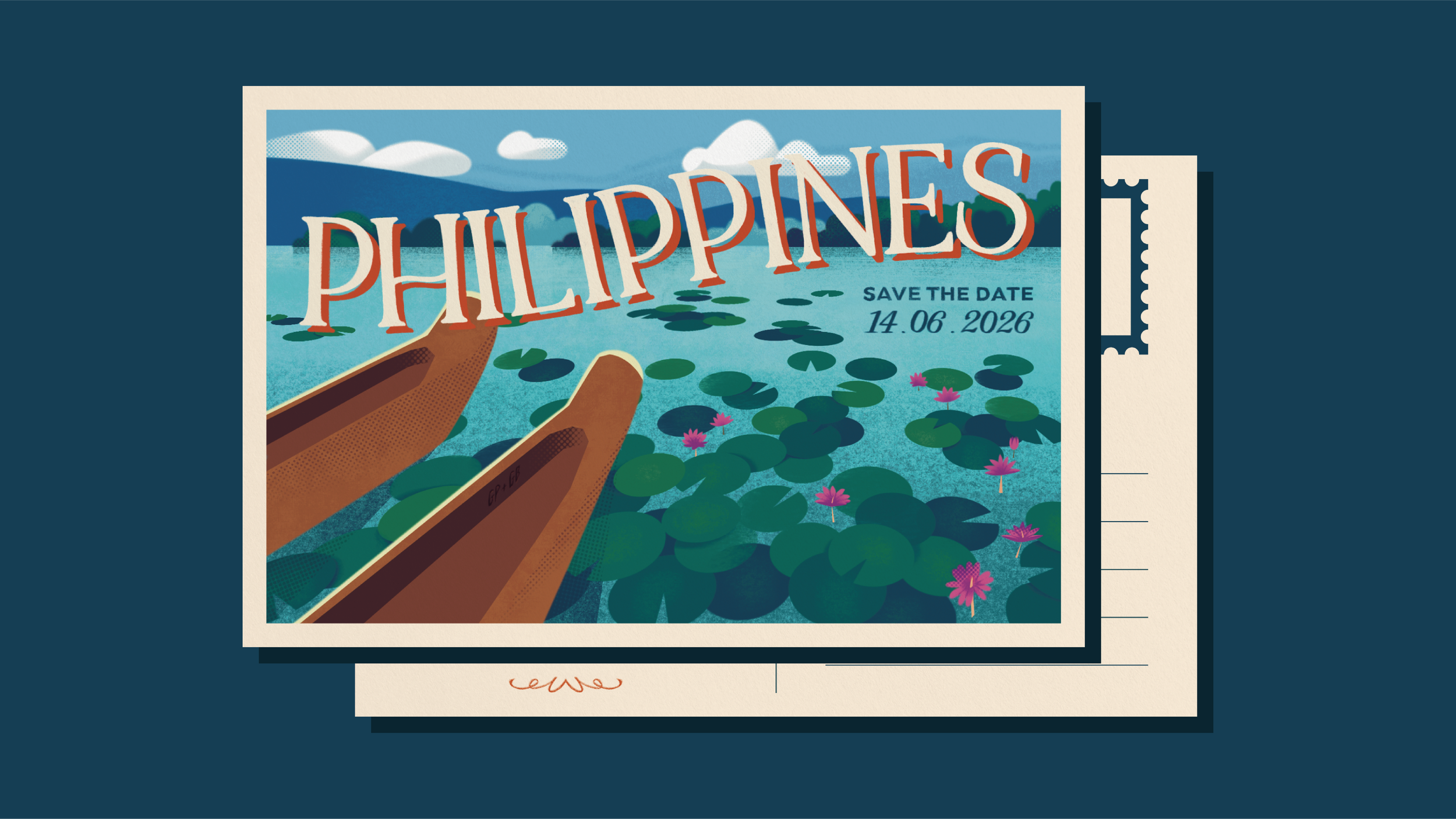 Vintage Postcard Wedding Invitation Design with an illustration of where the wedding is set which is in Philippines.